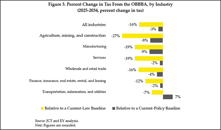Of the estimated net $4.5 trillion decrease in taxes from 2025-2034, this analysis estimates that OBBBA provisions will reduce business sector taxes by $1.8 trillion (approximately 40 percent of the net tax reduction), with the remaining reductions generally affecting nonbusiness individual income taxes.